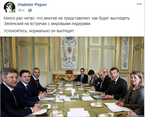 "Много раз читал, что многие не представляют, как будет выглядеть Зеленский на встречах с мировыми лидерами. Успокойтесь, нормально он выглядит".