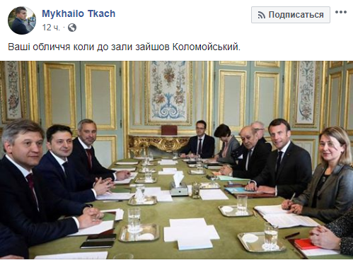 После встречи президента Франции Эммануэля Макрона и кандидата в президенты Украины Владимира Зеленского в Париже пользователи соцсетей обсуждают их совместное фото из кабинета в Елисейском дворце, придумывая подписи к нему. На фото слева от шоумена находился экс-заместитель министра юстиции Украины Руслан Рябошапка, а справа бывший министр финансов Александр Данилюк. Как уже писала "Страна", оба они являются советниками Зеленского.