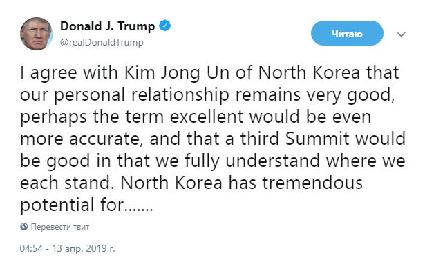 Президент США Дональд Трамп заявил, что не отвергает идею провести третий совместный саммит с лидером КГДР Ким Чен Ыном. Об этом он сообщил на своей странице в Twitter.