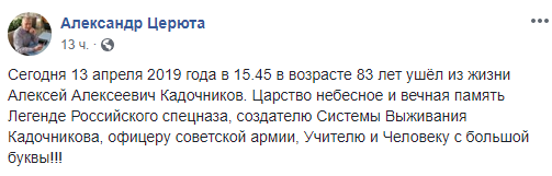 "Сегодня 13 апреля 2019 года в 15:45 в возрасте 83 лет ушёл из жизни Алексей Алексеевич Кадочников. Царство небесное и вечная память Легенде Российского спецназа, создателю Системы Выживания Кадочникова, офицеру советской армии, Учителю и Человеку с большой буквы!" - говорится в сообщении.