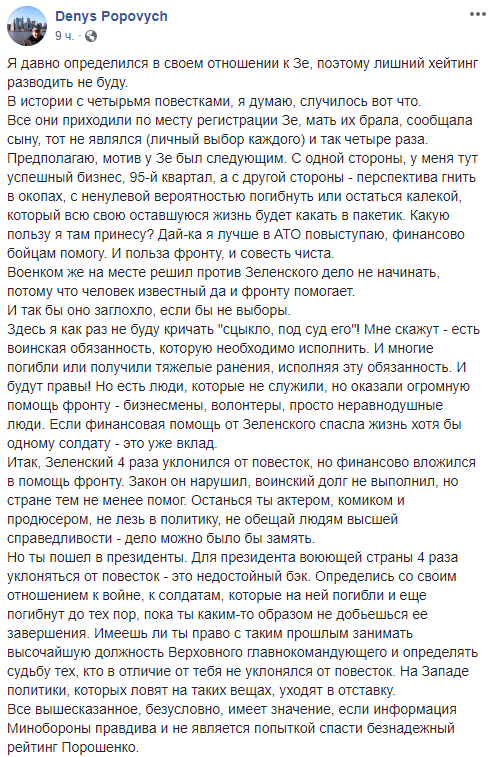 Но ты пошел в президенты. Для президента воюющей страны 4 раза уклоняться от повесток - это недостойный бэк. Определись со своим отношением к войне, к солдатам, которые на ней погибли и еще погибнут до тех пор, пока ты каким-то образом не добьешься ее завершения. Имеешь ли ты право с таким прошлым занимать высочайшую должность Верховного главнокомандующего и определять судьбу тех, кто в отличие от тебя не уклонялся от повесток. На Западе политики, которых ловят на таких вещах, уходят в отставку.
