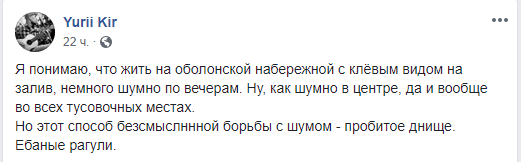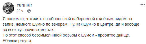 "Я понимаю, что жить на Оболонской набережной с клевым видом на залив, немного шумно по вечерам. Ну, как шумно в центре, да и вообще во всех тусовочных местах.