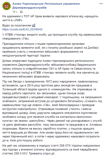 "...В 2014 году в течение двух месяцев он (задержанный - Прим. Ред.) работал в Луганской области водителем одного из "комендантов"... В дальнейшем, по приглашению знакомого, задержанный вступил в штурмовой батальон "Сомали" под руководством тогда еще живого Гиви", - уточнили пограничники.