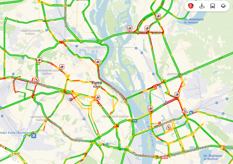 На проспекте Победы пробки возникают из-за реконструкции Шулявского моста. Огромный затор образовался в сторону станции метро "Политехнический Институт" - автомобили на участке дорог от станции метро "Житомирская" практически не движутся. Пробки наблюдаются также со стороны центра на выезд (их протяженность около 8 километров).