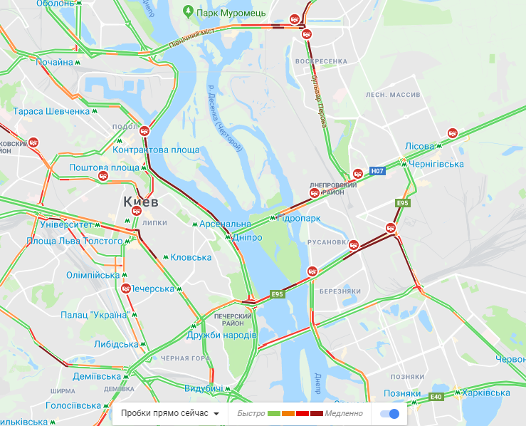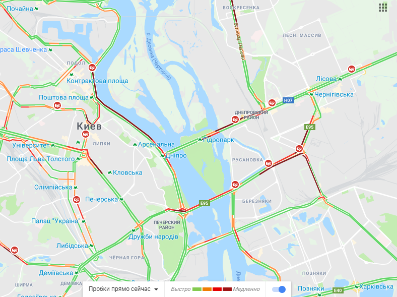 Сейчас тянучки и в центральной части Киева, в районе Бессарабского рынка. Кроме этого, затруднено движение по проспекту Леся Курбаса в сторону площади Победы. На мостах столицы также затруднено движение. Огромные пробки на левом берегу в районе станции метро "Левобережная", по проспекту Соборности, Дарницкому шоссе. Традиционно для этого времени суток тянучка наблюдается на Набережном шоссе.