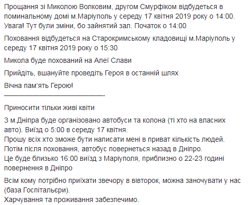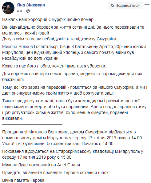 "Николай Волков, друг Смурфик - молодой 20-летний юноша из города Мариуполь, который с молодого возраста был неравнодушным к нашей Украине и ее судьбе. В июне 2018 он прошел наш учебный центр, и с 1 июля поехал на свою первую ротацию в составе нашего батальона. С осени 2018 года он был закреплен к 8 батальону УДА Аратта и ежедневно нес тяжкую ношу добровольца-парамедика", - рассказала Зинкевич о погибшем.
