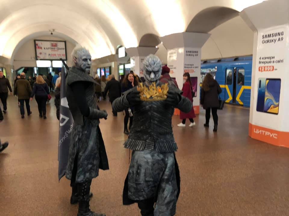 После премьеры финального сезона сериала "Игра престолов" в киевском метрополитене пассажиры заметили Белых ходоков из культовой телесаги. Об этом на своей странице в Facebook сообщила киевлянка Ксения Призиглей.