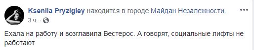 "Ехала на работу и возглавила Вестерос. А говорят, социальные лифты не работают", - говорится в сообщении. Она также опубликовала фото ходоков. Персонажей сериала можно было увидеть на станции "Майдан Незалежности". В руках одного из них была золотая корона, которую он надел на киевлянку, а второй держал флаг.