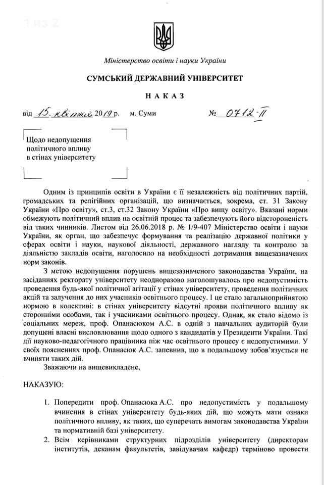 Согласно сканам приказа ректора вуза, которые опубликовал Геращенко, в качестве наказания Анатолию Опанасюку вынесут предупреждение о недопустимости в дальнейшем совершения в стенах университета любых действий, которые могут иметь признаки политического влияния.