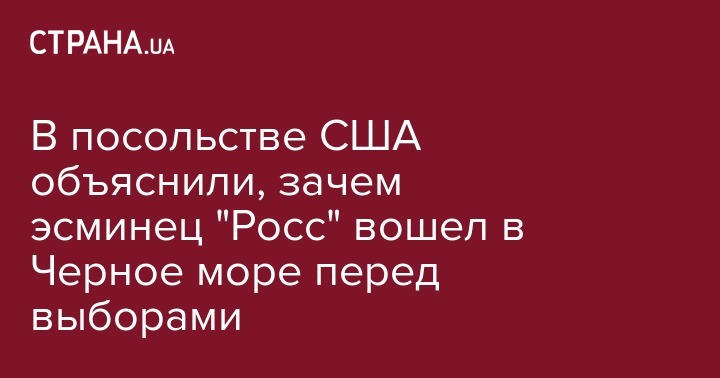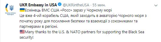 "Эсминец ВМС США "Росс" сейчас в Черном море. Это уже четвёртый корабль США, который входит в акваторию Черного моря с начала года для усиления безопасности и взаимодействия с союзниками и партнерами в регионе. Большое спасибо партнерам США и НАТО за поддержку безопасности на Черном море!", - говорится в сообщении.
