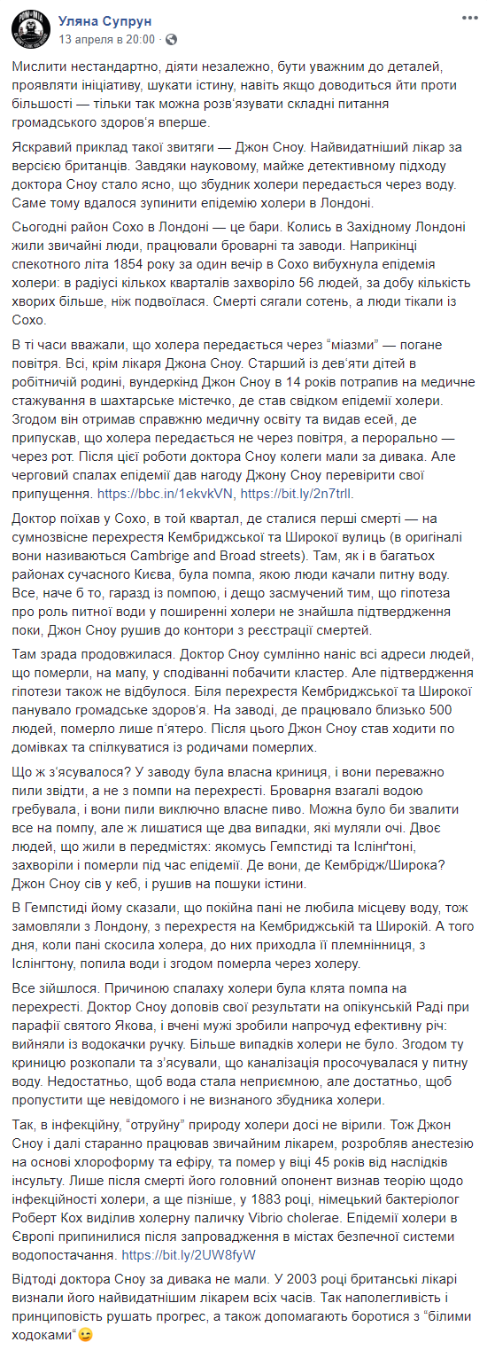 "Мыслить нестандартно, действовать независимо, быть внимательным к деталям, проявлять инициативу, искать истину, даже если приходится идти против большинства - только так можно решать сложные вопросы общественного здоровья впервые. Яркий пример такой победы - Джон Сноу. Величайший врач по версии британцев. Благодаря научному, почти детективному подходу доктора Сноу стало ясно, что возбудитель холеры передается через воду. Именно поэтому удалось остановить эпидемию холеры в Лондоне", - написала Супрун, рассказав историю выдающегося врача и его так борьбу с холерой.