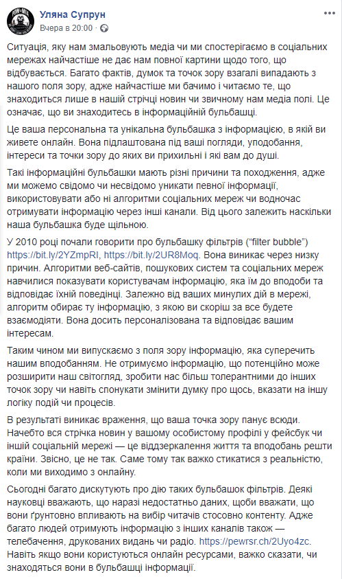 "Таким образом мы упускаем из поля зрения информацию, которая противоречит нашим предпочтениям. Не получаем информацию, что потенциально может расширить наш кругозор, сделать нас более толерантными к другим точкам зрения или даже побудить изменить мнение относительно чего-то, указать на иную логику событий или процессов. Как результат, возникает впечатление, что ваша точка зрения господствует повсюду. Вроде вся лента новостей в вашем личном профиле в Facebook или другой социальной сети – это отражение жизни и предпочтений остальной страны. Конечно, это не так. Именно поэтому так тяжело сталкиваться с реальностью, когда мы выходим из онлайн-жизни", – говорит Супрун.