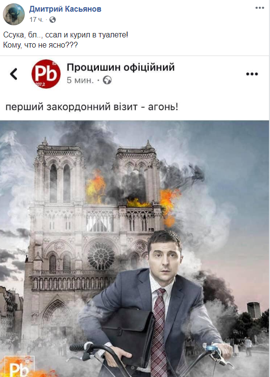 "Действовали системно, нагло, открыто. Можете убедиться в этом сами. Уже совсем скоро с этой жесткой реальностью предстоит столкнуться любому из вас, кто посмеет высказать толику критики в адрес г-на Зеленского... Что до Парижского собора, его потеря является безусловной трагедией для мировой культуры, и я скорблю о его утере вместе со всей французской нацией. Я не имел намерения обидеть ничьи чувства и приношу свои извинения всем, кого оскорбила моя неудачная шутка. Собор в моем посте был всего лишь неудачной метафорой, и поэтому я удаляю свою неоднозначную шутку из прошлого поста", – заявил Березовец.