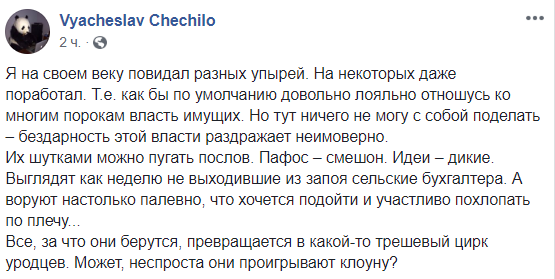"Я на своем веку повидал разных упырей. На некоторых даже поработал. Т. е. как бы по умолчанию довольно лояльно отношусь ко многим порокам власть имущих. Но тут ничего не могу с собой поделать – бездарность этой власти раздражает неимоверно.