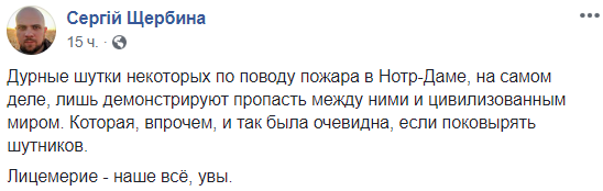 "Дурные шутки некоторых по поводу пожара в Нотр-Даме на самом деле лишь демонстрируют пропасть между ними и цивилизованным миром. Которая, впрочем, и так была очевидна, если поковырять шутников.