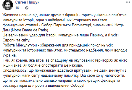 Министр культуры Украины Евгений Нищук в связи с масштабным пожаром в Соборе Парижской Богоматери выразил сожаление и заявил, что Украина готова отправить лучших специалистов во Францию, чтобы те поучаствовали в восстановлении культурного памятника. Об этом он написал на своей странице в Facebook.