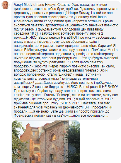 Пользователи также забросали министра целым огромным списком неотреставрированных объектов культурного наследия Украины: это и старинный цех пивзавода в Ивано-Франковске, и Червоноградский замок в Тернопольской области, и Невицкий замок, и многие другие.