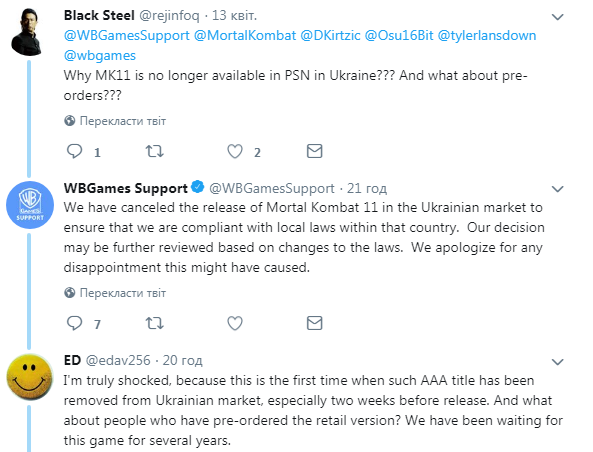 "Я действительно шокирован, потому что это первый раз, когда игра была удалена с рынка Украины, особенно за две недели до релиза. А как же люди, которые сделали предзаказ? Мы ждали эту игру несколько лет", - отметил один из пользователей.