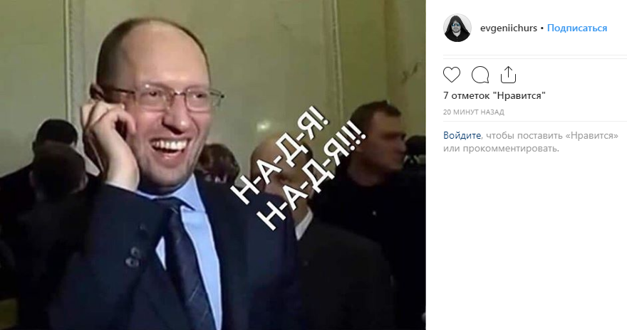 Так, Евгений Чурсин сделал фотожабу с Арсением Яценюком, говорящим по телефону и выкрикивающим: "Надя-Надя! Вова-Вова!"