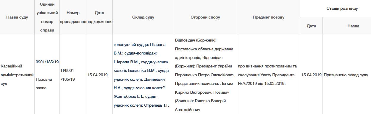 Экс-губернатор Полтавской области обратился в Кассационный административный суд 15 апреля. Он требует признать противоправным и отменить указ президента №76 от 15 марта о его увольнении. Кроме главы государства, ответчиком по делу выступает Полтавская ОГА.