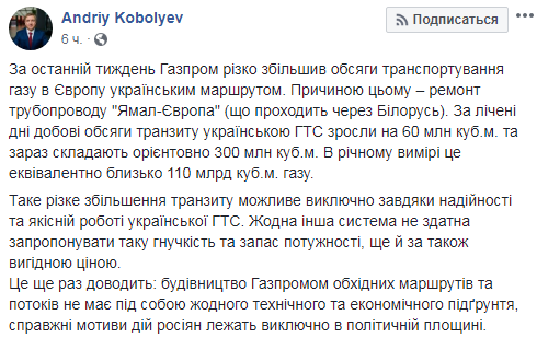 "За считанные дни суточные объемы транзита украинской ГТС выросли на 60 миллионов кубометров и сейчас составляют ориентировочно 300 миллионов кубометров. В годовом исчислении это эквивалентно около 110 миллиардам кубометров газа", - уточнил Коболев.