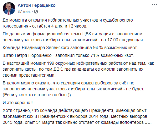"В целом можно сказать, что сценария срыва выборов за счёт незаполнения членами участковых избирательных комиссий не будет. И это хорошо", - говорится в Facebook-заявлении нардепа Антона Геращенко.