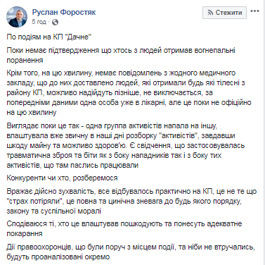 Надеюсь те, кто это устроил пожалеют и понесут адекватное наказание. Действия правохранителей, которые были рядом с местом происшествия, и будто не вмешивались, будут проанализированы отдельно", - написал Руслан Форостяк.