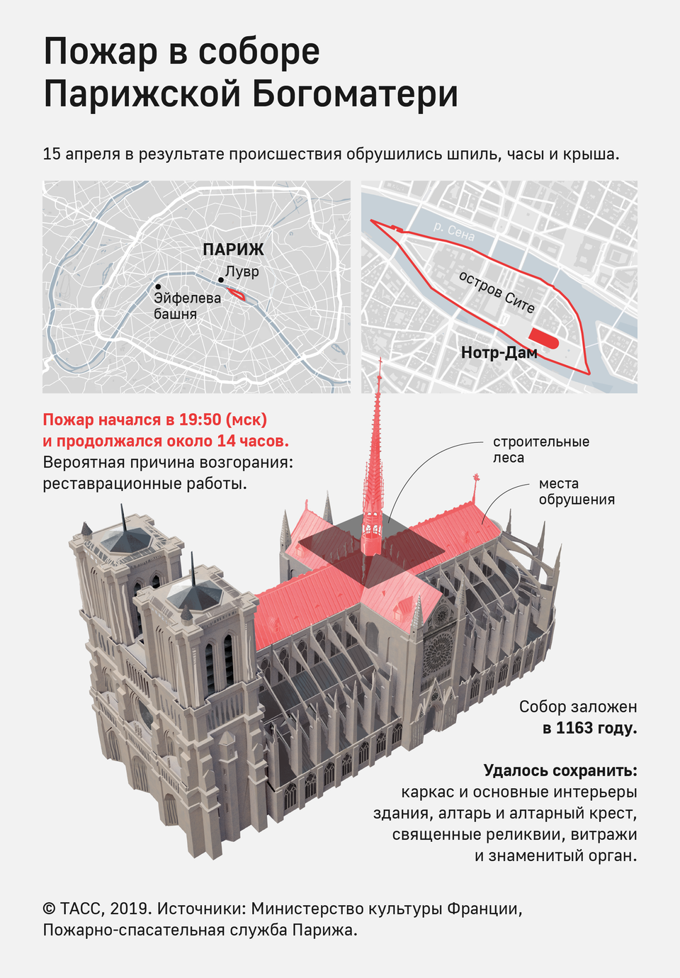 Напомним, что пожар в Соборе Парижской Богоматери начался вечером в понедельник, 15 апреля, его удалось полностью потушить лишь во вторник утром. Огонь уничтожил верхнюю часть шпиля, часы и большую часть кровли.
