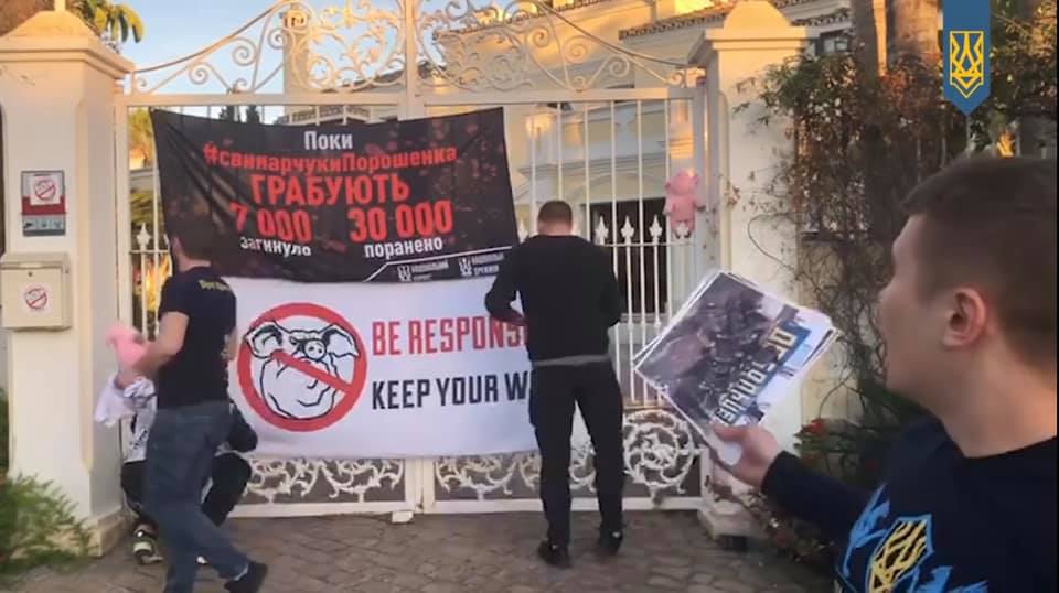Представители Нацкорпуса устроили акцию протеста у виллы президента Украины Петра Порошенко, о которой неоднократно писала "Страна", и одного из организаторов коррупционной схемы в Укроборонпроме в Испании. Соответствующее видео опубликовала пресс-служба партии на своей странице в Facebook.