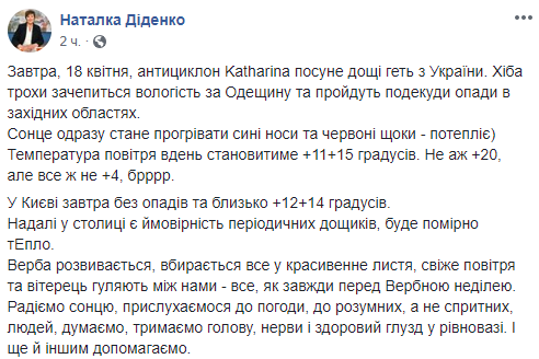 В четверг, 18 апреля, антициклон Katharina прогонит дожди из Украины, осадки могут зацепится в Одесской области и пройти местами в западных областях. Об этом сообщает синоптик Наталья Диденко на своей странице в Facebook.