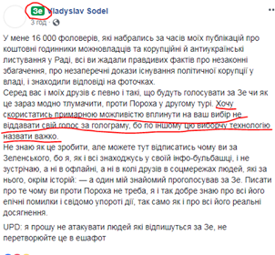 Несмотря на это, он является одновременно и "порохоботом", и сторонником Владимира Зеленского (в заблокированном аккаунте) по версии программы "Кто твой президент".