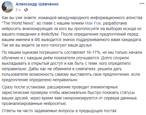 По словам Шевченко, после определения предпочтений перед именем пользователя в соцсети выводится значок поддерживаемого кандидата. Также благодаря приложению можно увидеть, за кого проголосуют ваши друзья в соцсети. Впрочем, разработчики предупреждают, что погрешность оценок может составлять 16-17%. Чтобы исправить ошибку пользователь может и сам выставлять свои предпочтения "вручную".