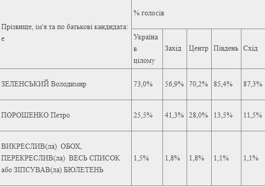 У Владимира Зеленского -73%. У Петра Порошенко - 25,5%. Испорченных бюллетеней - 1,5%.