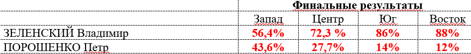 На Востоке за его кандидатуру отдали 88,1% (Петр Порошенко - 11,9%), на юге - 85,6% (Порошенко - 14,4%), Севере - 74,6% (Порошенко - 25,4%), Центре - 78,8% (Порошенко - 21,2%), Западе - 52% (Порошенко - 48%), Киеве - 59,5% (Порошенко - 40,5%).