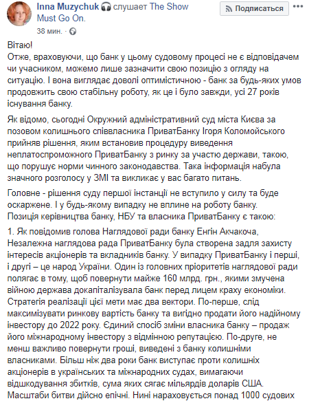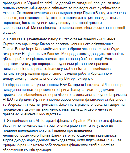 Музычук подчеркнула, что, по данным НБУ, решение Окружного админсуда Киева по иску бывшего совладельца "Приватбанка" Игоря Коломойского не вступило в законную силу и будет обжаловано Национальным банком, который продолжит доказывать законность действий и принятых решений регулятора в апелляционной инстанции. Как сообщили в Министерстве финансов Украины, Минфин также не соглашается с указанным решением и готовится к подаче апелляционной жалобы.