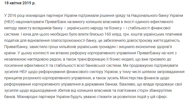 "В 2016 году международные партнеры Украины поддержали решение правительства и Национального банка Украины (НБУ) национализировать ПриватБанк по требованию бывших владельцев в качестве единственного эффективного метода защиты вкладчиков банка - украинского народа и бизнеса - и стабильности финансовой системы.