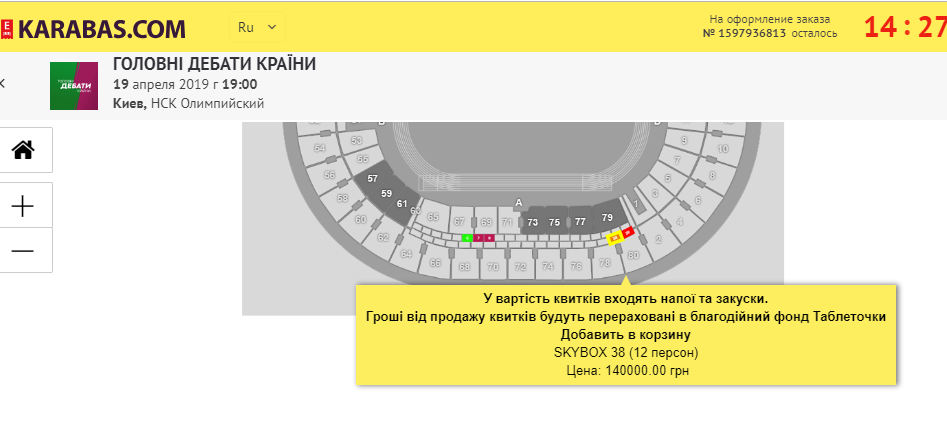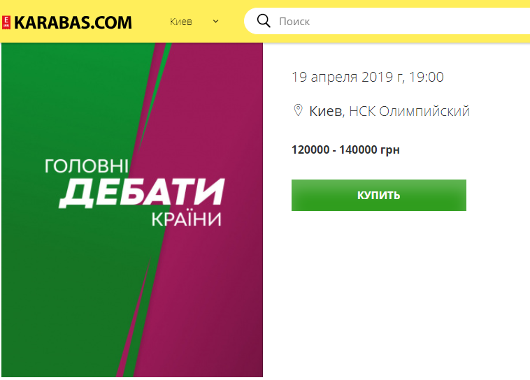 В сети за баснословные деньги предлагают купить билеты на завтрашние предвыборные дебаты между кандидатами в президенты Петром Порошенко и Владимиром Зеленским, которые в пятницу, 19 апреля в 19:00 должны начаться в Киеве на НСК "Олимпийский".