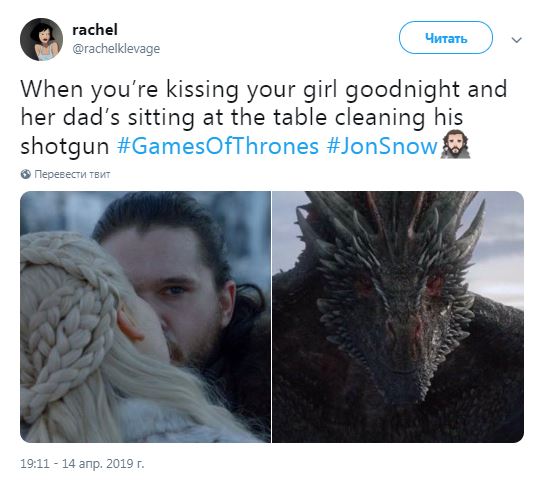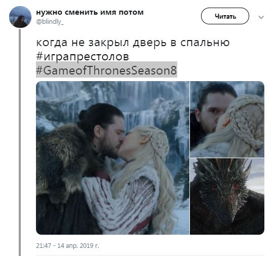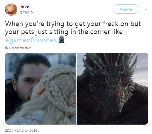 После первой серии восьмого сезона появился мем. Пользователи оценили сцену с драконом, который наблюдает за поцелуем Джона Сноу и Дейенерис. Красноречивый взгляд огнедышащего существа выглядел слишком осуждающим, что вызвало бурю шуток в сети.