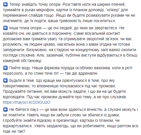 "Говорить на публике рано или поздно приходится многим из нас, и это весьма непросто. Нервничать из-за выступления перед аудиторией, особенно большой, нормально. Главное - научиться контролировать свои эмоции. Мы подобрали несколько советов, чтобы вы были готовы к публичным выступлениям", - говорится в сообщении Ульяны Супрун.