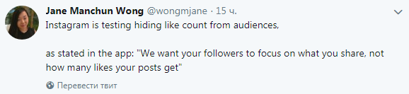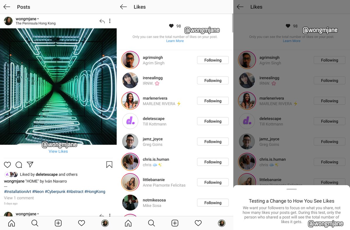 На скриншотах Вонг видно, что в новом дизайне пост в Instagram не содержит счетчика лайков, но все же показаны несколько лиц и имена других людей, которым он понравился. Пользователям сообщают, что только они увидят в своем сообщении число лайков. Представитель Instagram подтвердил, что на размещенных Вонг изображениях действительно новый дизайн фотоплатформы. Тем не менее, добавили в компании, он пока не тестируется.