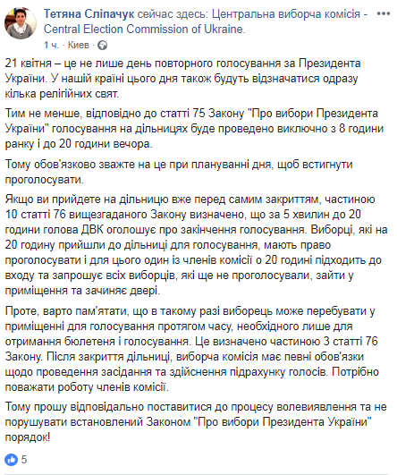 Слипачук отметила, что согласно статье 75 закона "О выборах президента Украины" голосование на участках будут проведены исключительно с 8:00 до 20:00. В связи с тем, что 21 апреля отмечается несколько религиозных праздников, которые не позволяют представителям некоторых конфессий реализовывать свое право голоса в это время, председатель ЦИК напомнила про то, что существует механизм, позволяющий голосовать и после закрытия участков.