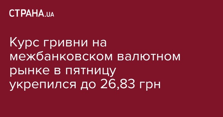 Курс гривни на межбанковском валютном рынке в пятницу укрепился до 26,83 грн/$1 с 26,8475 грн/$1 в предыдущий рабочий день, сообщает "Интерфакс-Украина" со ссылкой на дилеров коммерческих банков.