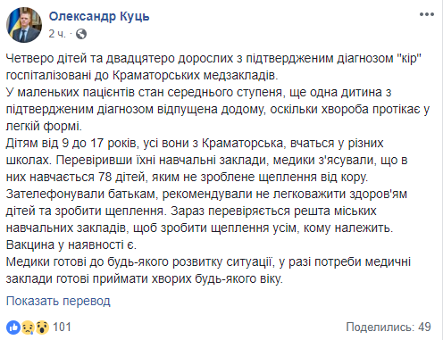 "У маленьких пациентов состояние средней степени, еще один ребенок с подтвержденным диагнозом отпущен домой, поскольку болезнь протекает в легкой форме", - говорится в сообщении. По информации Куця, все инфицированные дети - в возрасте от 7 до 17 лет, учатся в разных школах Краматорска.