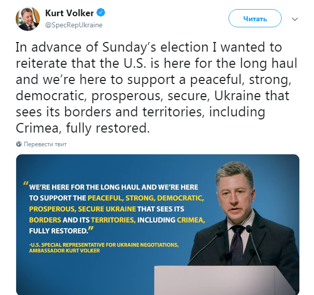 "Накануне воскресных выборов я хотел бы повторить, что США здесь надолго, и мы здесь, чтобы поддержать мирную, сильную, демократическую, процветающую, безопасную Украину, которая видит свои границы и территории, включая Крым, полностью восстановленными" - написал Волкер.