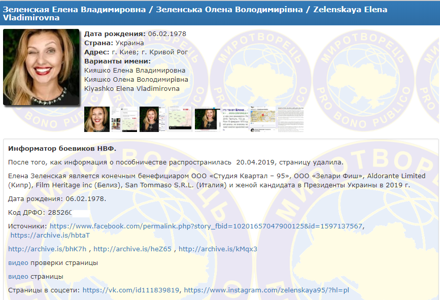 Сегодня, 20 апреля, на скандальный сайт "Миротворец" внесли супругу кандидата в президенты Владимира Зеленского Елену. Причина, по которой Елена Зеленская попала на сайт - "информатор боевиков". Об этом говорится в описании на сайте.