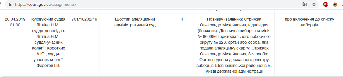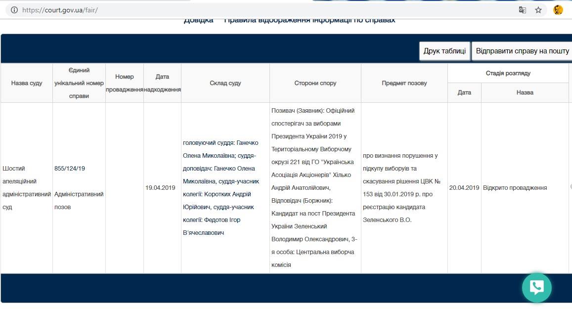 В соответствии с информацией на сайте Судебной власти Украины, дело №855/124/19 о признании нарушений в подкупе избирателей и отмене решения ЦИК № 153 от 30.01.2019 г. о регистрации кандидата Зеленского В.А. действительно будет рассматриваться сегодня, 20 апреля в Шестом апелляционном суде.