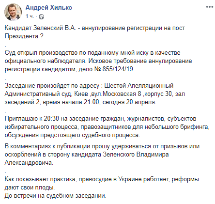 Вечером в субботу, 20 апреля, Шестой апелляционный суд Киева рассмотрит возможное аннулирование регистрации Владимира Зеленского кандидатом в президенты. Об этом на своей странице в Facebook заявил адвокат Андрей Хилько, который и подал соответствующий иск.