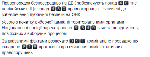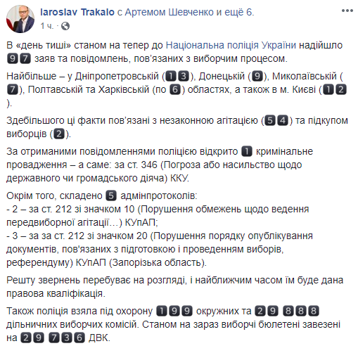 "В "день тишины" по состоянию на сейчас в Национальную полицию Украины поступило 97 заявлений и сообщений, связанных с избирательным процессом", - сообщил он.