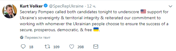 "Госсекретарь Помпео звонил вечером обоим кандидатам, чтобы подчеркнуть американскую поддержку суверенитета и территориальной целостности Украины и подтвердил нашу приверженность работе с теми, кого украинский народ выбирает для обеспечения успеха безопасной, процветающей, демократичной и свободной Украины", - написал Волкер.