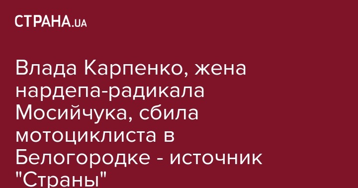Вчера, 19 апреля, в селе Белогородка, произошло ДТП в котором серьезно пострадал водитель скутера. Как стало известно "Стране" из источников в Верховной Раде, за рулем авто, которое сбило скутериста была Влада Карпенко, жена нардепа - радикала Игоря Мосийчука. Свидетели ДТП подтвердили, что на месте водителя в авто сидела женщина.